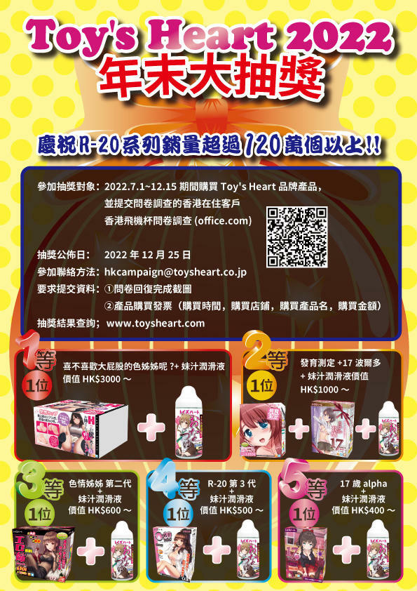 於2022.7.1 – 12.15期間購買任何Toy’s Heart產品,並填寫簡單網上問卷,再到Toy’s Heart官網提交相關產品收據,及遞交問卷的截圖,即可參加 Toy’s Heart 大抽獎 。