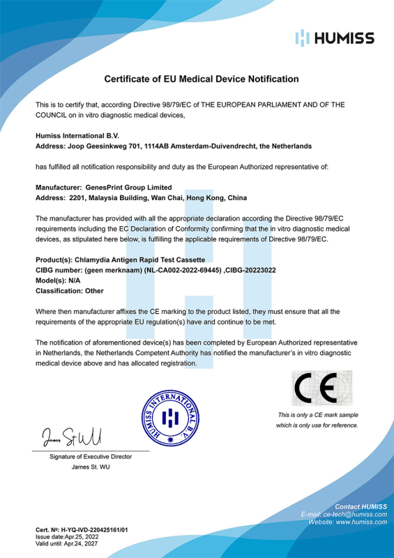 本產品用於體外定性檢測人的尿液, 唾液, 體液中是否含有沙眼衣原體抗原,臨床輔助判斷人體是否受到沙眼衣原體的感染。