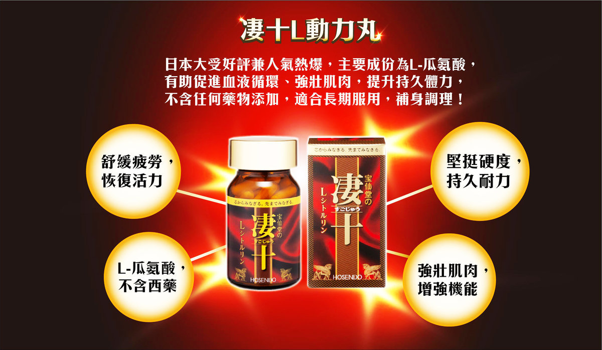 日本製造,凄十L動力丸的主要成份為L-瓜氨酸,有助促進血液循環、強壯肌肉,從而激發男士澎湃起動力和旺盛精力,有助保持堅挺硬度及持久耐力,表現剛勁自信,與伴侶盡享激情快感。