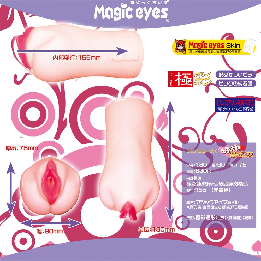 Magic Eyes - 極彩名器 Lavieen Roses 維納斯的花園 薔薇乙女 軟版,比之前的版本帶來更加真實的少女插入體驗。約630g的她擁有薔薇形的純潔膜,在她秘密花園的入口,保留著堅貞的她在維納斯花園裡等待命中注定的人,俵三段精巧的仿真膣璧設計正是測試你是不能通過這一場愛的考驗,你是否能通過這越來越緊的花園路,成為薔薇少女命中注定的人呢?