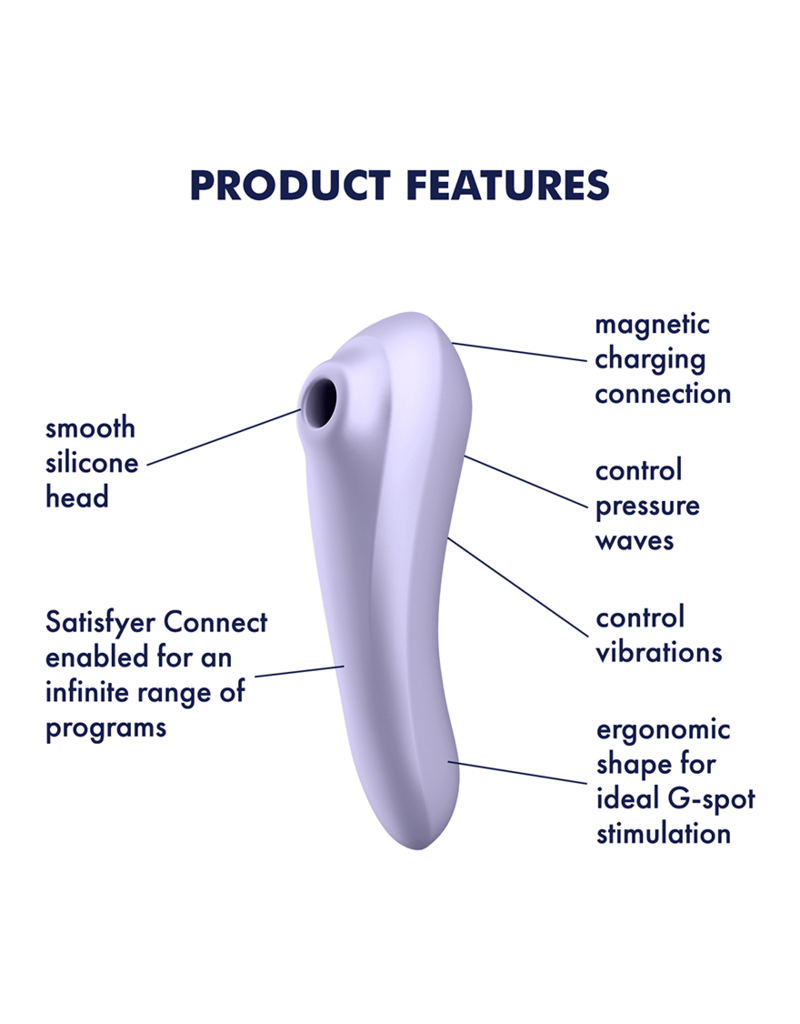 DUAL PLEASURE的高雅簡約設計具有多功能性,可以選擇獨立控制陰蒂空氣脈沖壓力波或刺激g點振動。 DUAL PLEASURE有白色和淡紫色兩種顏色,由100%人體安全的矽膠製成。這種感性的觸感柔軟,並具有更精確的空氣脈衝腔,可進行集中刺激。此外,得益於其彎曲的感官設計,當將其翻轉以供內部使用時,DUAL PLEASURE可以輕鬆用於與珍貴的g點傾斜。